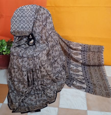 Black and Cream Kalamkari Block Hand Block Print Cotton Saree -0021